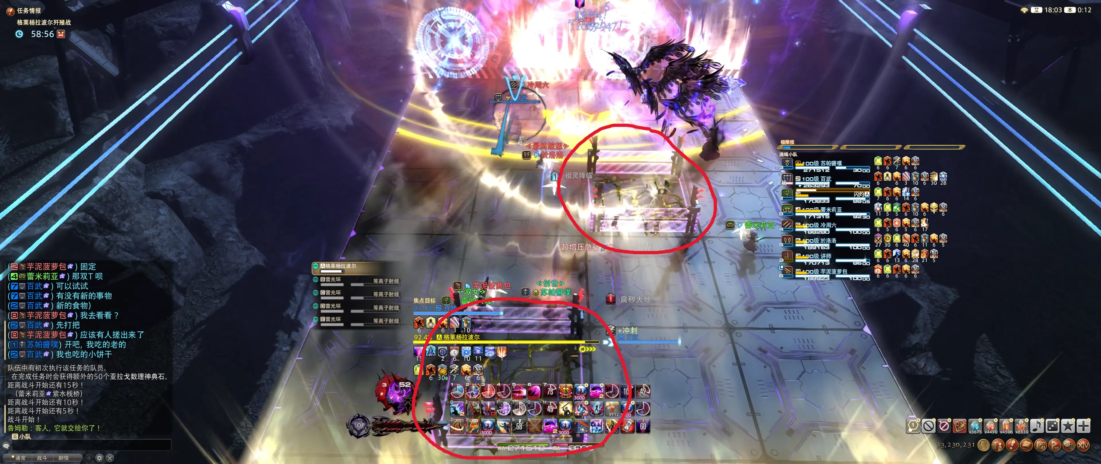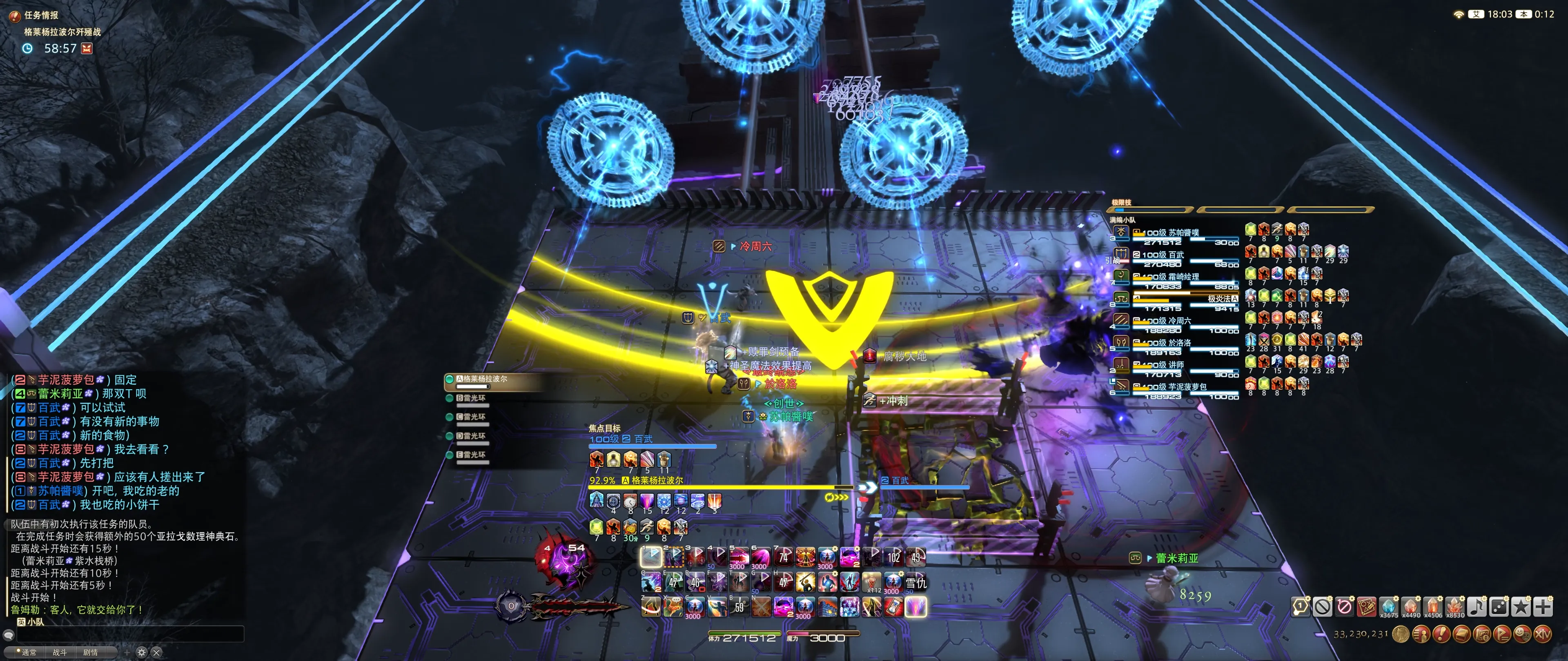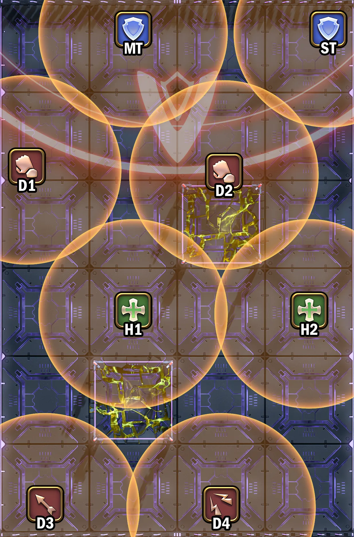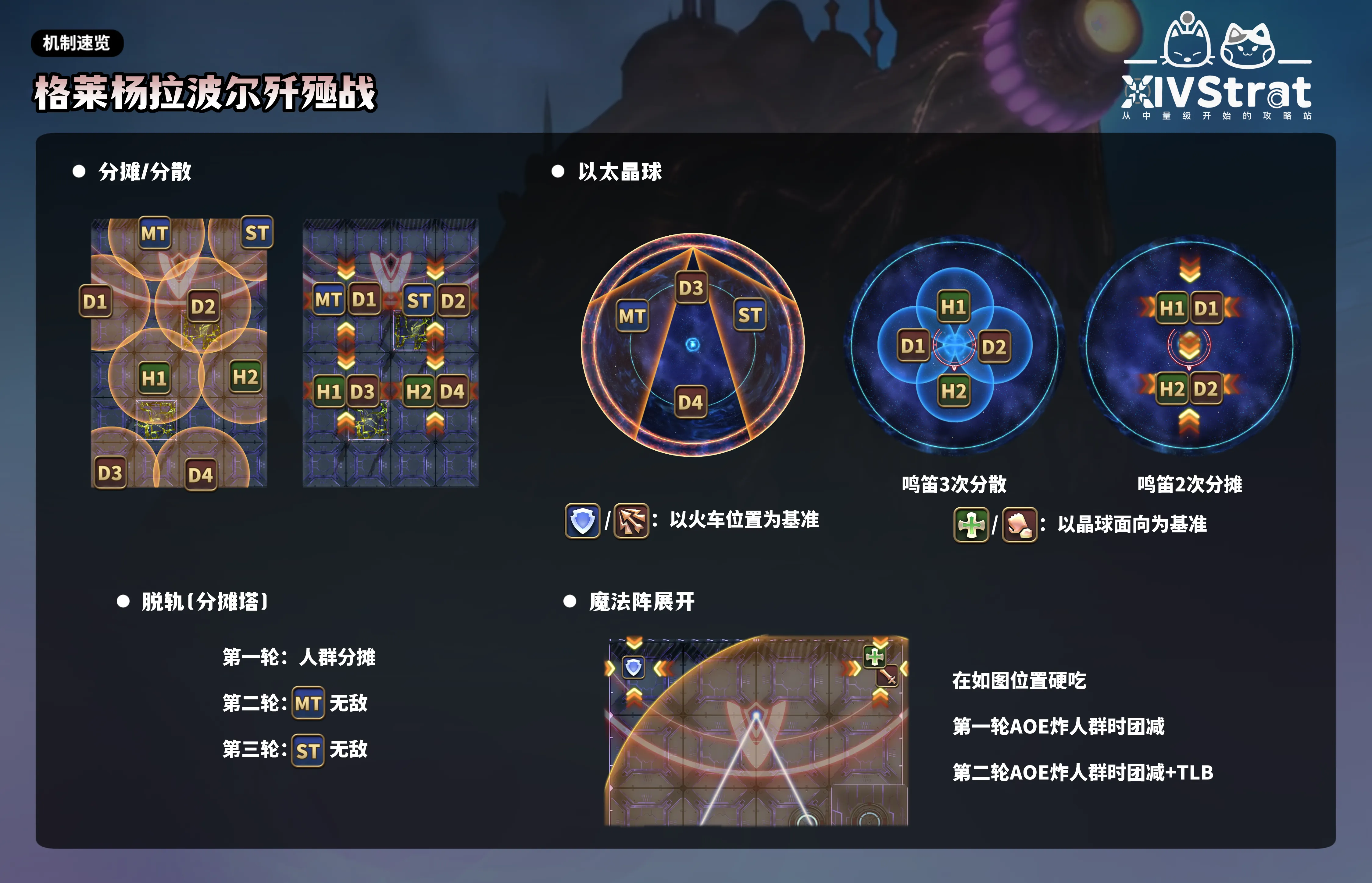 BOSS读条时,前方浮现4/8个蓝色雷球,分别代表存储22分摊/8人分散,之后会延时释放,造成131000的魔法伤害,大致按下图站位处理即可: